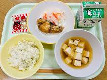 本日の献立は、菜めし、魚の蒲焼き(ふくらぎ)、なます、すまし汁、節分豆、牛乳 です。