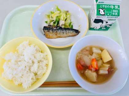 本日の給食は、ごはん、いわしのおろし煮、野菜ソテー、豚肉とじゃがいものうま煮、牛乳 です。
