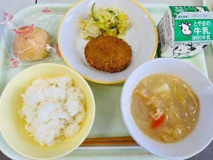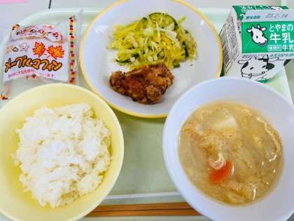 ごはん、(豚肉の竜田揚げor肉じゃがコロッケ)、あわせ和え、みそ汁、(いちごのシュークリームorメープルマフィン)、牛乳です。