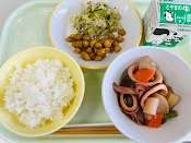 本日の献立は、ごはん、フライビーンズ、ゆかり和え、いかと里芋の煮物、牛乳 です。