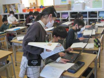 国語では、「これがわたしのお気に入り」の学習をしています。お気に入りの物や場所等を友達に紹介するために、クロームブックを使って文章をかいています。
