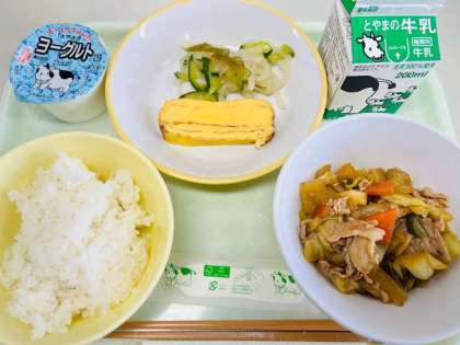 本日の献立は、ごはん、厚焼き卵、茎わかめの酢の物、ホイコーロー、ヨーグルト、牛乳 です。