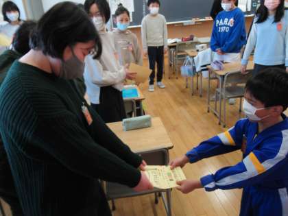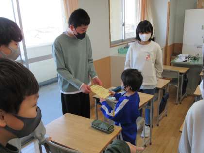 2月27日(月)、卒業お祝い集会に向けて作成した招待状を6年生に渡しに行きました。6年生からは、「ありがとう。楽しみにしているね。」「上手にかけているね。」等、優しい言葉をかけてもらいました。6年生が喜んでいる姿を見て、2年生も嬉しそうな表情をしていました。