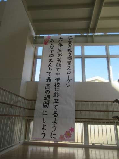 2月27日(月)、今日から一週間卒業を祝う週間が始まりました。学校の壁面もお祝いムードになり、中央階段には先日5年生の2名が書いたスローガンが掲示されています。今日から4日間、5年生が代表して6年生にインタビューをする放送を行います。6年生には、小学校生活の思い出や在校生へのメッセージを話してもらいました。6年生の言葉からは、一人一人の思いがひしひしと伝わってきました。