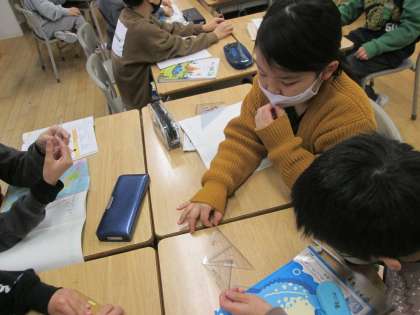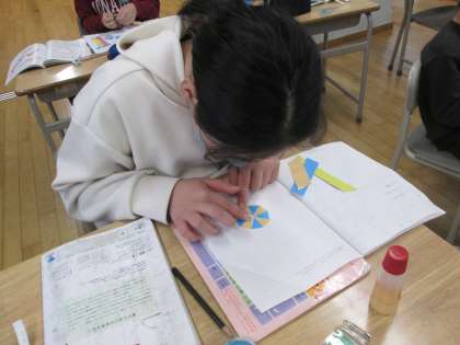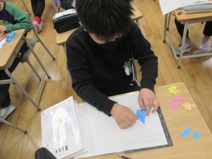 3月2日(木)、算数「三角形を調べよう」の学習で、二等辺三角形や正三角形を組み合わせて模様を作りました。それぞれの三角形の特徴を生かして、「富士山」や「キャンディー」等、アイディアを膨らませていました。