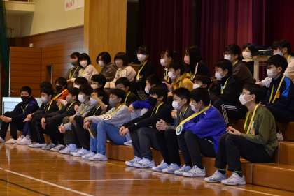 3月3日(金)、今日は卒業を祝う週間最終日。数年ぶりの全校全員での卒業を祝う会が行われました。写真は、1年生からの出し物の様子です。1年生は「6年生との思い出」について発表してくれました。6年生が頷きながら真剣に聞いている様子が印象的でした。