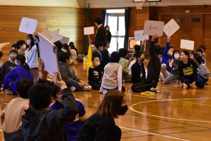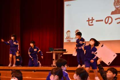 4年生は縦割り班で行う「以心伝心ゲーム」をしました。4年生の出題者が出したお題「○○といえば」を縦割り班で考え、どれだけの答えが一致するか楽しむゲームでした。4年生の子どもたちは、自分たちでスライドを作っていました。