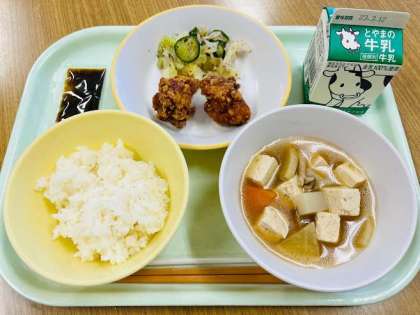本日の献立は、ごはん、鶏肉の竜田揚げ、ゆかり和え、けんちん汁、のり佃煮、牛乳 です。
