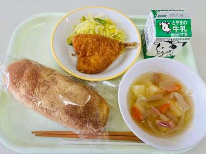 本日の給食は、揚げパン、あじフライ、アスパラサラダ、ポテトスープ、牛乳 です。