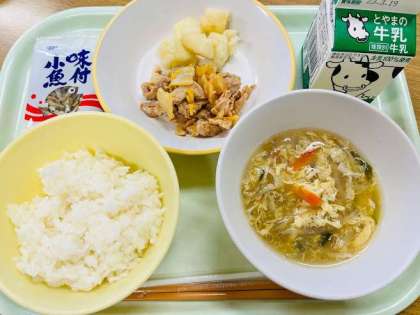 本日の献立は、ごはん、豚肉のキムチ炒め、粉ふき芋、中華かき玉汁、味付け小魚、牛乳 です。