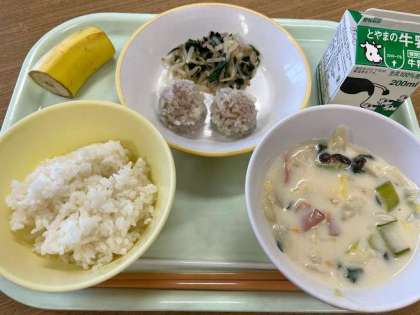 本日の献立は、ごはん、珍珠丸子、もやしとニラのソテー、白菜のクリーム煮、バナナ、牛乳 です。