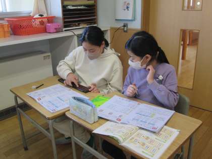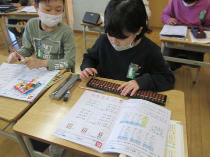 3月20日(月)、算数ではそろばんの学習をしました。初めてそろばんに触れた子も多かったため、最初は苦戦していましたが、やり方が分かってくるとスムーズに計算できるようになりました。