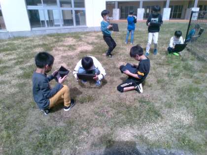 理科「あたたかくなると」では、中庭にある植物を観察しにいきました。