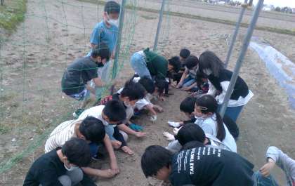 ヘチマの種を植えました。早く大きくなってほしいとワクワクする様子が見られました。