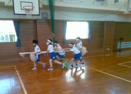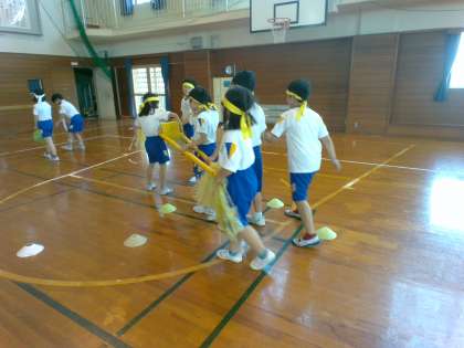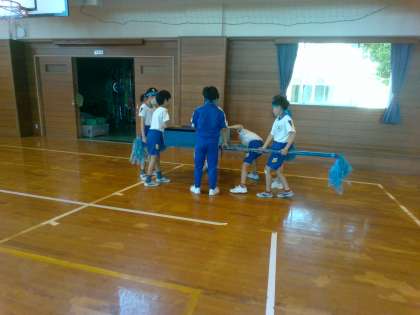 体育科では、道具を使った運動として宝運びに挑戦しました。大小異なる物を宝として運び、どのように工夫すると速く簡単にできるのかを考えていました。