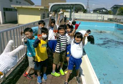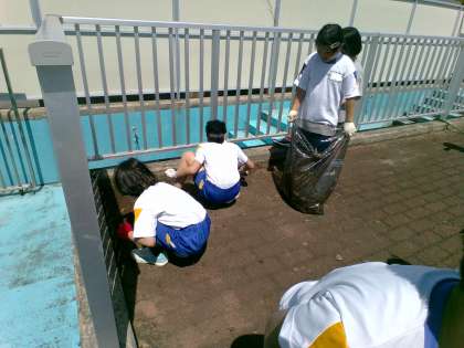 プールサイドの除草をしました。たくさん草が生えておりゴミ袋が何袋もいっぱいになりました。