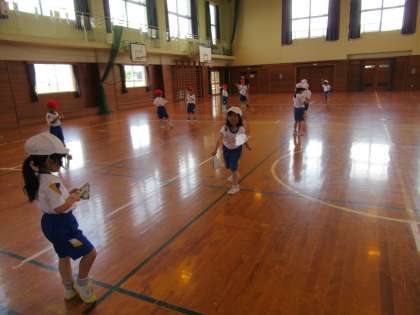 まず紙鉄砲を作って、大きな音が鳴るようにやってみました。次第に、子供たち同士で「手を斜め上に向けるといいよ」「足を前に出すと力が入るよ」とアドバイスをし合っていました。