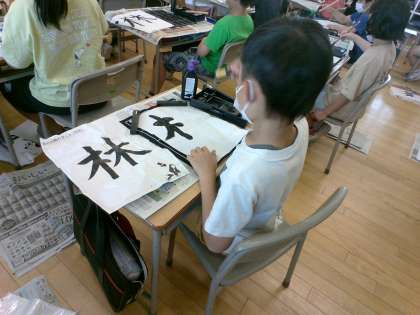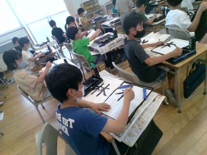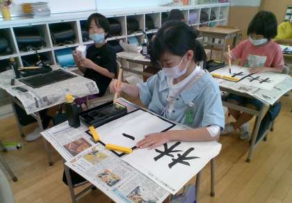 書写の時間には、姿勢や筆の持ち方に気を付けながら書いています。左右のバランスや始筆・終筆を意識して何度も取り組む様子が見られました。
