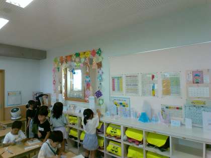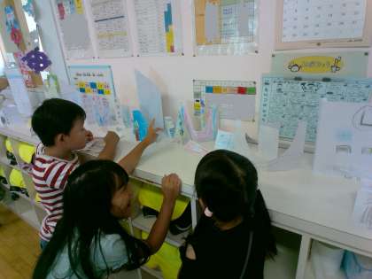 そして、作った作品を並べていると「ここは電車とホテルがあるから駅にしよう!」「魚がたくさんいるから水族館もできそうだね!」と、どんどん作品が繋がっていき、1年1組の素敵な街が出来上がりました。