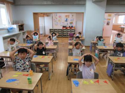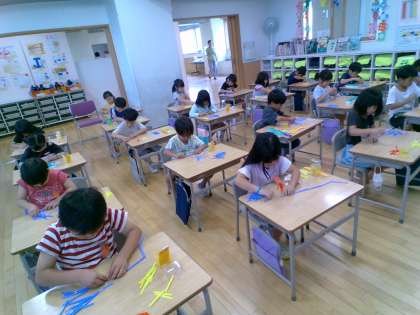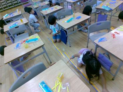 算数科では、「どちらがながい」の学習で、棒を繋げて長いへびを作る「へびへびせんしゅけん」をしています。