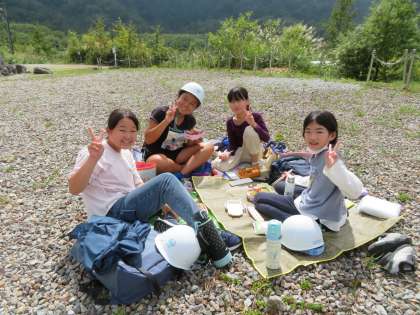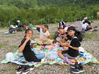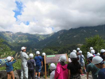 立山カルデラ博物館の次は、六九谷展望台や「崩れの碑」のある場所でカルデラの様子を見ました。子供たちは素敵な景色をバックにおいしそうにお弁当を食べていました。