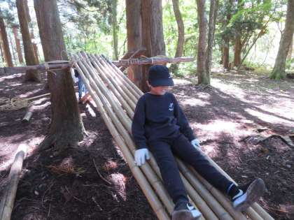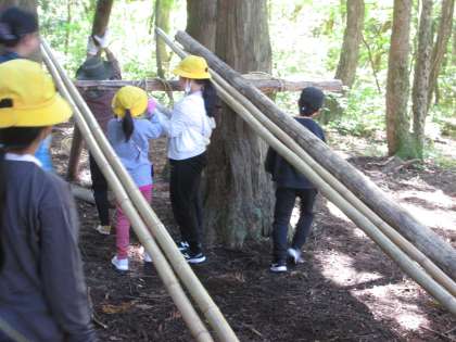 立山青少年自然の家で「森の遊び場つくり」を体験しました。チームで作りたい物を話し合い、完成させました。雄大な自然の中で、みんなが作った遊び場で遊ぶのはとても気持ちよかったですね。これからも自然に親しみましょう。