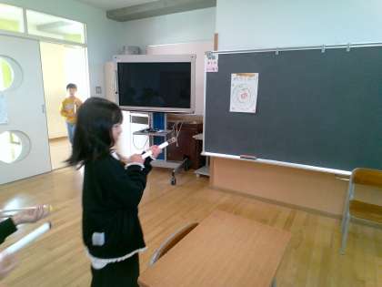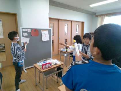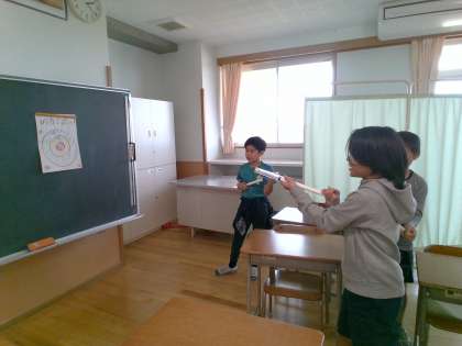 理科「とじこめた空気と水」では、空気鉄砲で的あてをして、気付いたことを伝え合いました。