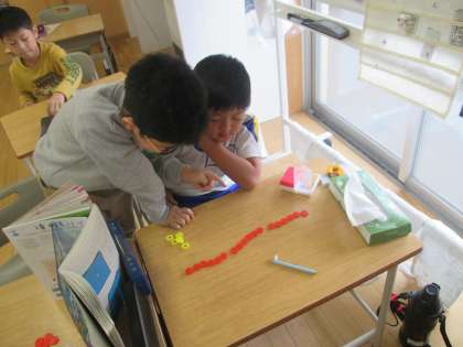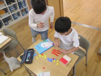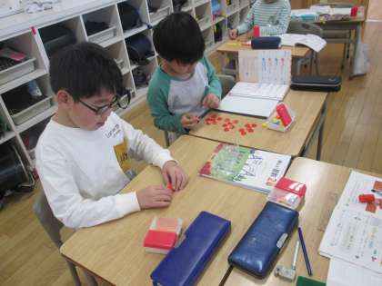 2学期になり、いよいよかけ算の学習が始まっています。今日は、おはじきをつかって、友達と問題の出し合いをしました。