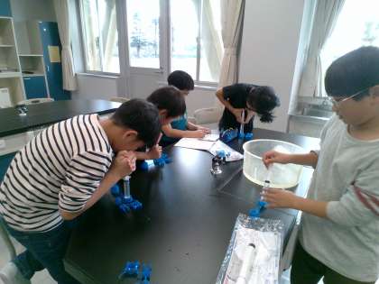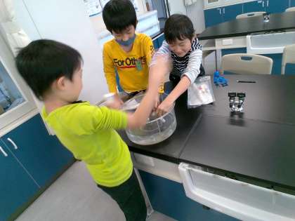 理科では、とじこめた空気に続いて、とじこめた水を押すとどうなるのかを実験しました。子供たちは、空気と同じだと予想していましたが、水の体積が変わらないことを体感して驚いていました。
