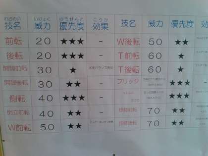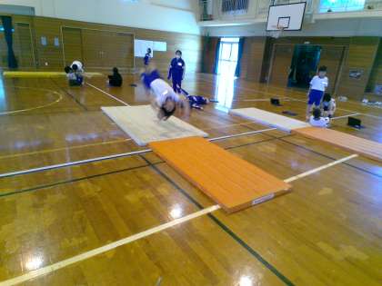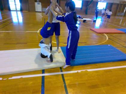 マット運動の学習が始まりました。子供たちは「技表」を見ながら、どの技でチームに貢献しようか考えながら、仲間と共に技の練習に取り組んでいました。