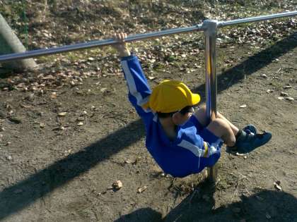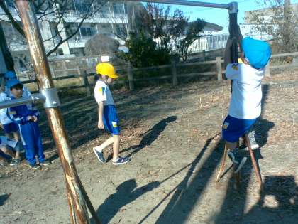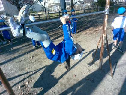 エビやイモムシ等、今まで出てこなかった新しい生き物になりきる子もいれば、マットの時と同じ生き物を鉄棒で挑戦している子もいました。使う道具が変わると、動きが変わる面白さを感じられました。