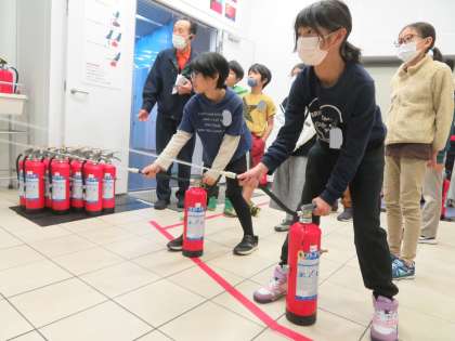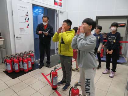 子供たちは、周囲の人に気づいてもらえるよう大きな声で「火事だ」と叫んだ後、消火器を使って消火体験をしました。