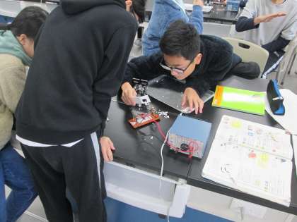 理科では、電熱線に電気を流すと発熱するか実験しました。