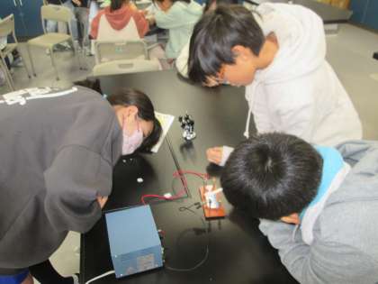 電熱線に発砲ポリスチレンを当てると、切れたり形が変わったりして、驚いていました。