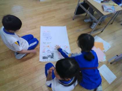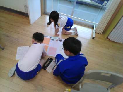 12月1日に訪問した太田地区センターと浮田家について、クループごとに調べたことを絵や図や文にしてまとめています。