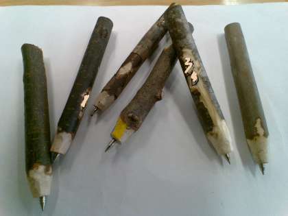 富山市野外教育活動センターと富山県呉羽青少年自然の家から3名の職員の方々をお招きし、木の枝を使ったボールペンづくりを教えていただきました。小刀を用いて、名前を入れたり、模様を付けたりして、思い思いのボールペンを作りました。