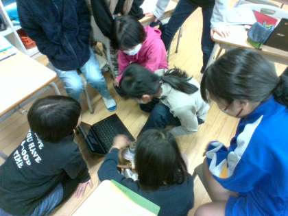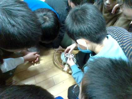 4年生では、宿泊学習に向けて、かんじきのはき方を練習します。