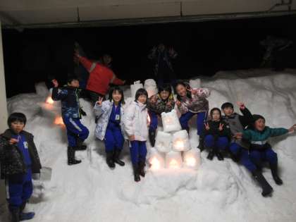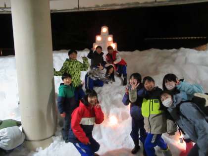 暗くなる前に、班の仲間と協力してキャンドル用のミニかまくらをつくった後、中にろうそくを立て、点灯しました。