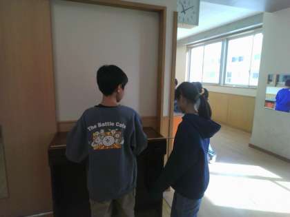 1mの長さを体感できるように、1mものさしを使って身の回りにある約1mの長さのものを探しました。最初はなかなか見つけられませんでしたが、1つ見つかると「先生、あった!」と、どんどん1mのものが見つけられるようになってきました。