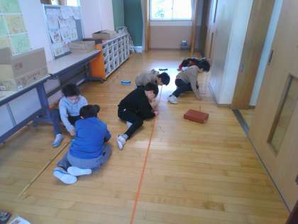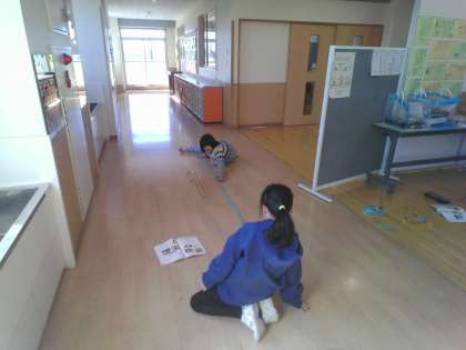 今日は、紙テープを使って、3mものさしを作りました。次の時間は、この手作りものさしを使って、1m以上のいろいろなものの長さを調べます。