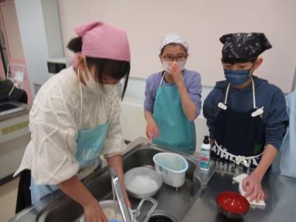 今日は、ごはんとみそ汁をつくりました。グループで相談し選んだ具でみそ汁を作ったため、グループごとに具が違っていました。
