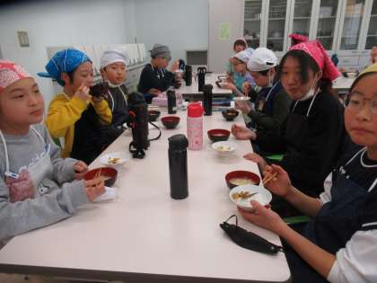 完成後は試食をしました。うまくできたグループもそうではなかったグループも自分たちで調理したごはんとみそ汁を残さず食べていました。
