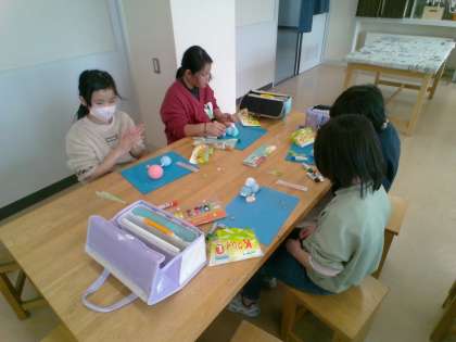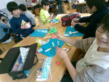 図画工作科「環境 見守り神」では、紙粘土を使って、自然の守り神をつくりました。自分のイメージを話しながら楽しく活動しました。