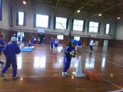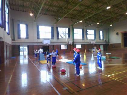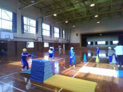 今日の体育は、楽しく体を動かせるコースを団ごとに自分たちで考えました。今日は赤団が考えたコースにチャレンジしました。