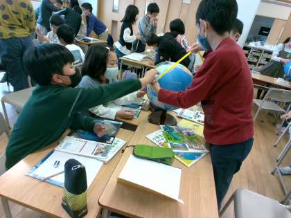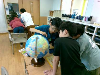 社会科「わたしたちの国土」(5年生) 公開日 2024/04/16 更新日 2024/04/16 5年生 今日の社会科では、地球儀の学習に取り組みました。 緯度や経度で位置を表したり、実際の距離を求めたりしました。