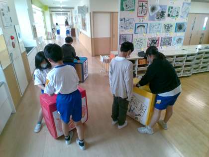 休み時間には、運動会に向けてマスコットキャラクターを宝箱に進んで貼り付ける姿がありました。いいね!