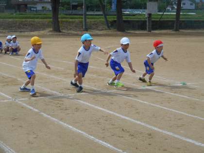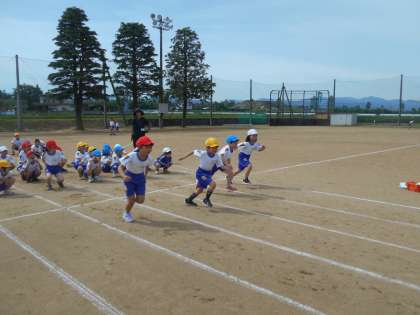運動会予行練習では、50メートルを実際に走りました。 「位置について、どん!」の構えがかっこいいです。