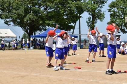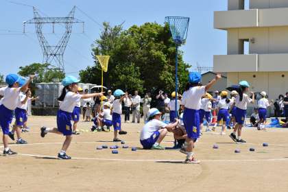 低学年競技「ダンシング玉入れ」では、楽しく踊りながら競技を行いました。