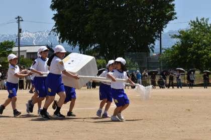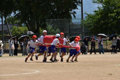縦割り班競技「宝運び」では、協力しながら取り組みました。みんなで応援し合うあたたかい姿もありました。