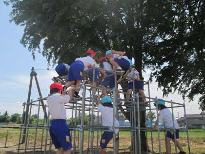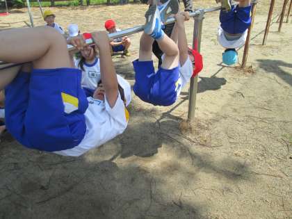 今日は、ジャングルジムを使って登ったり下りたりしました。また、鉄棒では、鉄棒の握り方を知らせました。その後、「ダンゴムシ」や「ブタのまるやき」など、いろいろなぶら下がりかたをして楽しみました。